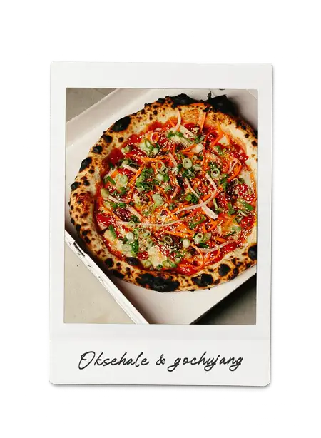 Tomatsaus, oksehale, gochujang, mozzarella, varløk, sesam, syltet daikon og gulrot.